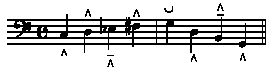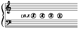 21.6. In facsimile transcriptions, when the pedal and left-hand parts are written on the same print staff, the combined prefix from Table 20 is used for the first measure of the passage and the parts are placed in separate in-accords. The normal left hand prefix is used for succeeding parallels. When the pedal part drops out, if it is not obvious from the music itself, the prefix @> is used once.