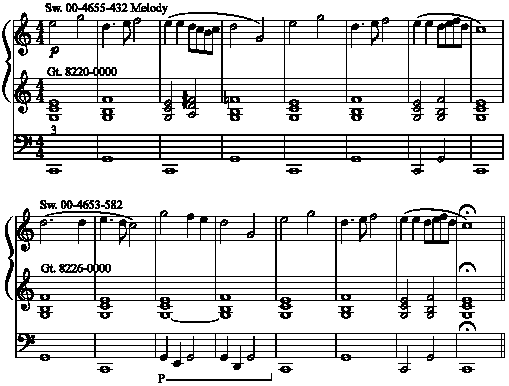21.4. The tabulation of the details of organ registration at the commencement of a piece should follow as far as possible the method used in a good print edition, though the difference between the length of the lines in print and braille will sometimes enforce some readjustments. The following is a typical specimen: